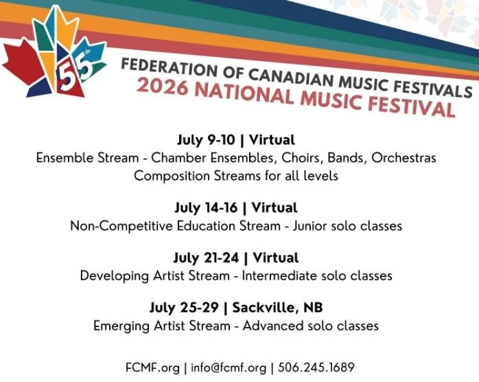 Every music festival in Canada is invited to participate in the National Music Festival, subject to the general regulations of the National Festival. At the local festival there may be one winner named in each of the following classes: solo voice, pianoforte solo, string solo, woodwind solo, brass solo and instrumental ensemble. Read More... (minimum of three, maximum of five performers).